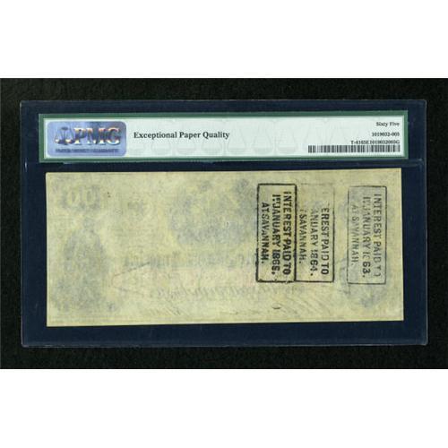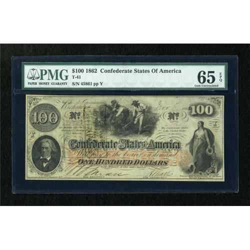 <B>T41 $100 1862.</B></I><BR> This fully-framed note appears to be all the grade, and possibly more, if not for a single pinhole at center. Watermarked with "CSA" in block letters, and having three Savannah-issued Interest stamps on back. <B>PMG Gem Uncirculated 65 EPQ</B></I>.<BR><BR><b>Shipping:</b> Coins & Currency (<a target="_blank" href="http://www.heritageauctions.com/common/shipping.php">view shipping information</a>)