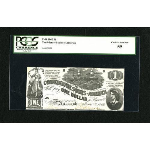<B>T44 $1 1862.</B></I><BR> This Lucy Pickens is quite bright and scarce in this high grade. <B>PCGS Choice About New 55</B></I>.<BR><BR><b>Shipping:</b> Coins & Currency (<a target="_blank" href="http://www.heritageauctions.com/common/shipping.php">view shipping information</a>)<BR><BR><B>I