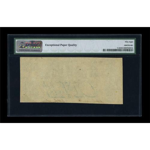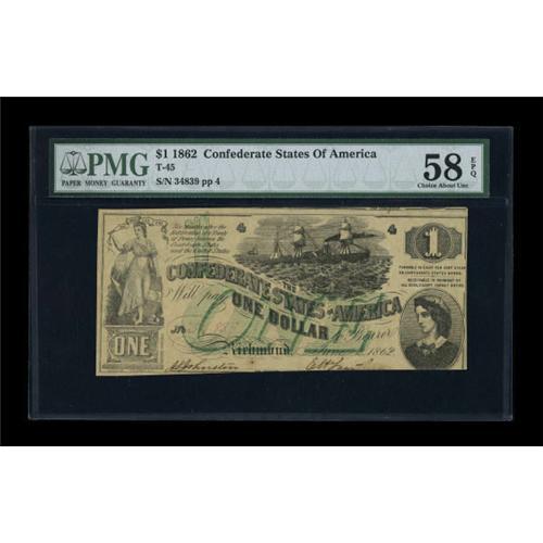 <B>T45 $1 1862. </B></I>Cr 342 PF-2<BR> Here is another pleasing example of this issue, which is elusive in high grade. This Second Series note is a bit miscut along the margin at lower right, but still retaining some eye appeal. A pinhole is also noticed for full disclosure. <B>PMG Choice About Unc 58 EPQ.</B></I><BR><BR><b>Shipping:</b> Coins & Currency (<a target="_blank" href="http://www.heritageauctions.com/common/shipping.php">view shipping information</a>)