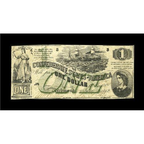 <B>T45 $1 1862.</B></I> The Confederate government was unwilling to pay for the added green overprint of this design resulting in this short-lived issue. This <B>Fine</B></I> example with its wholesome edges is better than many other Fines on the market.<BR><BR><b>Shipping:</b> Coin/Currency (<a target="_blank" href="http://www.heritageauctions.com/common/shipping.php">view shipping information</a>)
