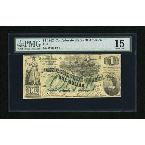 <B>T45 $1 1862.</B></I> This $1 has some brightness left in its paper. <B>PMG Choice Fine 15.</B></I><BR><BR><b>Shipping:</b> Coins & Currency (<a target="_blank" href="http://www.heritageauctions.com/common/shipping.php">view shipping information</a>)