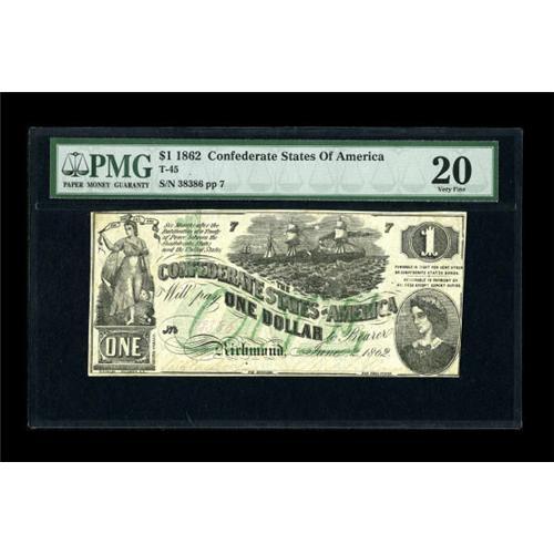<B>T45 $1 1862.</B></I><BR> The Confederate government was unwilling to pay for the added green overprint of this design, resulting in this short-lived issue. This <B>PMG Very Fine 20</B></I> example with solid edges is quite colorful.<BR><BR><b>Shipping:</b> Coins & Currency (<a target="_blank" href="http://www.heritageauctions.com/common/shipping.php">view shipping information</a>)