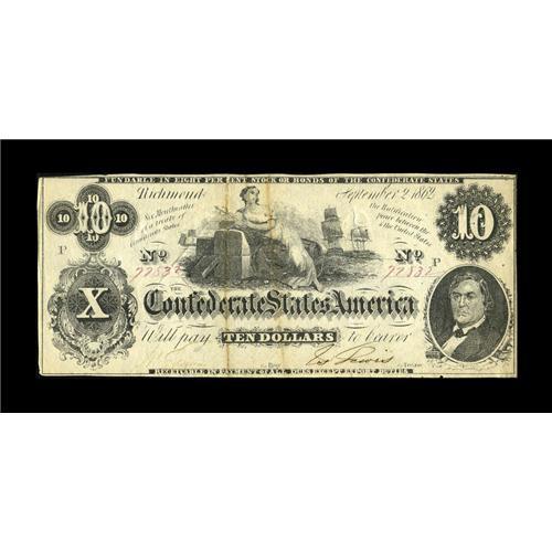 <B>T46 $10 1862.</B></I> Although printed in 1861, this type was dated 1862 in error. This <B>Extremely Fine,</B></I> CC example is nicely centered and two of the folds show soiling. This note is the variety with the letter "s" after "Month" in the redemption clause.<BR><BR><b>Shipping:</b> Coins & Currency (<a target="_blank" href="http://www.heritageauctions.com/common/shipping.php">view shipping information</a>)