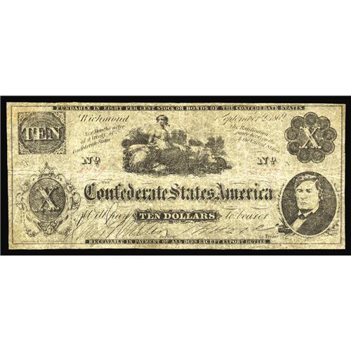 <B>T48 $10 1862.</B></I> This rare "Essay" note is now accepted for the most part as a contemporary fantasy note by the CSA collecting community. It is still avidly sought after by Confederate enthusiasts due to its being listed in the Criswell reference for so long. This specimen is one of only three examples of the T48 that we have had to offer in the past six years. This is an attractive <B>Fine,</B></I> with wholesome edges, nice margins, and a single pinhole at top center where it may have been pinned for a display in its distant past. The lateral center fold is the strongest, while the other folds are well suited for a mid-grade note. Fricke assigns this note as a Rarity 6, 13 - 30 known. Don't let another two years pass before adding this elusive type to your collection.<BR><I>From The Benjamin Rush Powel Collection of Confederate Currency.</B></I>