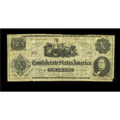<B>T48 $10 1862.</B></I> This rare "Essay" note is now accepted for the most part as a contemporary fantasy note by the CSA collecting community. It is still avidly sought after by Confederate enthusiasts due to its being listed in the Criswell reference for so long. This is an attractive <B>Very Fine,</B></I> with even wear and the lower right-hand corner tip missing. Still a Confederate rarity.