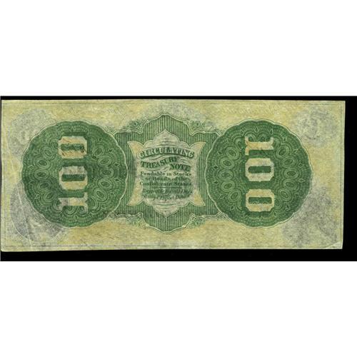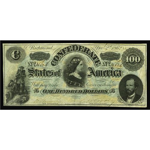 <B>T49 $100 1862.</B></I> A broad corner fold accounts for the handling on this C-note with four delightful margins. <B>Choice About Uncirculated.</B></I>