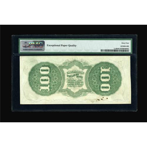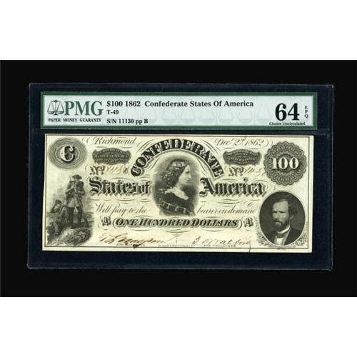<B>T49 $100 1862.</B></I> Cr-348 PF-2<BR> This is a lovely example of the first CSA $100 note to have a printed back. <B>PMG Choice Uncirculated 64 EPQ.</B></I><BR><BR><b>Shipping:</b> Coins & Currency (<a target="_blank" href="http://www.heritageauctions.com/common/shipping.php">view shipping information</a>)