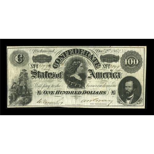 <B>T49 $100 1862 Cr. 348 PF-2.</B></I><BR> This Lucy Pickens note is fully framed, and quite pleasing for the grade. <B>Very Fine.</B></I><BR><BR><b>Shipping:</b> Coins & Currency (<a target="_blank" href="http://www.heritageauctions.com/common/shipping.php">view shipping information</a>)