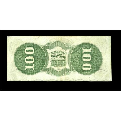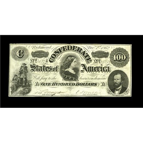 <B>T49 $100 1862.</B></I> Even circulation with light folds are found on this <B>Very Fine</B></I> C-note that also exhibits an approximate half inch top edge tear.<BR><I>From The Benjamin Rush Powel Collection of Confederate Currency.</B></I>