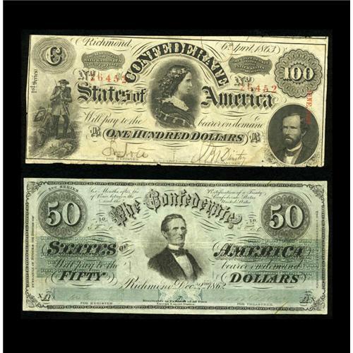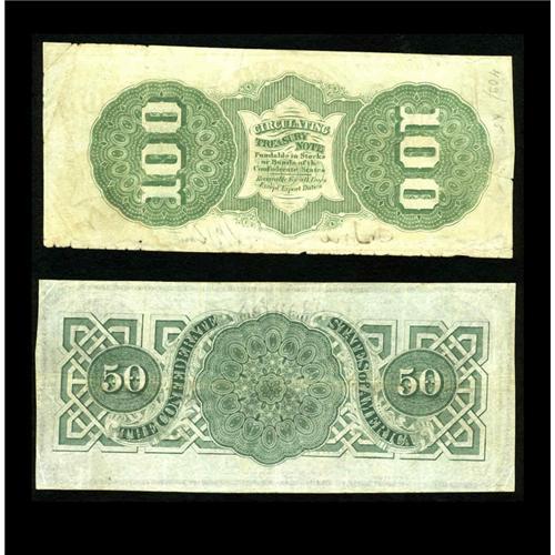 <B>T49 $100 1862 Fine</B></I><BR><B>T50 $50 1862 Fine-VF, CC.</B></I><BR>The Lucy Pickens C-note displays an approximate half inch left edge tear plus other edge abrasions. <BR><BR><B>Imp