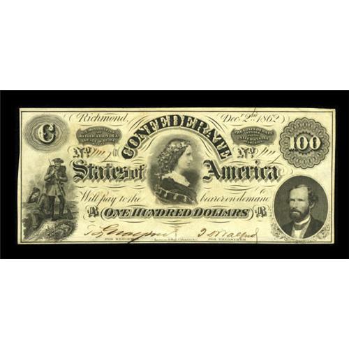 <B>T49 $100 1862. Cr. 348</B></I><BR> This bright early CSA Lucy Pickens note carries the wavy lines/CSA watermark.<BR><B>Extremely Fine-About Uncirculated</B></I>.<BR><BR><b>Shipping:</b> Coins & Currency (<a target="_blank" href="http://www.heritageauctions.com/common/shipping.php">view shipping information</a>)