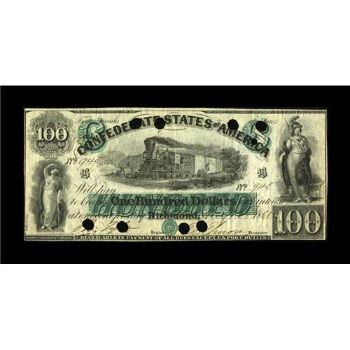 <B>T5 $100 1861.</B></I> This $100 was printed by the Southern Bank Note Company. It has been cut cancelled and nicely repaired. It has also been punch cancelled ten times. The punch cancels were repaired at one time in the distant past, but nine of the PC repairs have since failed. This was a common way to cancel this issue. A small edge tear has also been repaired. The note remains attractive and it also becomes a more affordable representative of a very difficult type as only 5798 were printed. The back reveals an endorsement, a small red "H", and an April 21, 1863 stamping for 425 days of interest. These notes were not the first notes to be issued from the new Confederate capital at Richmond, but the "First Richmond" moniker has stuck since the earliest days of collecting Confederate notes. <B>Fine-Very Fine,</B></I> CC and POC.<BR><BR><b>Shipping:</b> Coins & Currency (<a target="_blank" href="http://www.heritageauctions.com/common/shipping.php">view shipping information</a>)