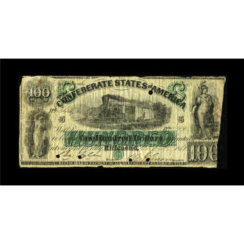 <B>T5 $100 1861. POC.</B></I><BR> Low serial number 245 is noticed on this early Richmond issue that has been punch cancelled. A strange cut at right is noticed. <B>Good-Very Good, </B></I>POC<B>.</B></I><BR><BR><b>Shipping:</b> Coins & Currency (<a target="_blank" href="http://www.heritageauctions.com/common/shipping.php">view shipping information</a>)