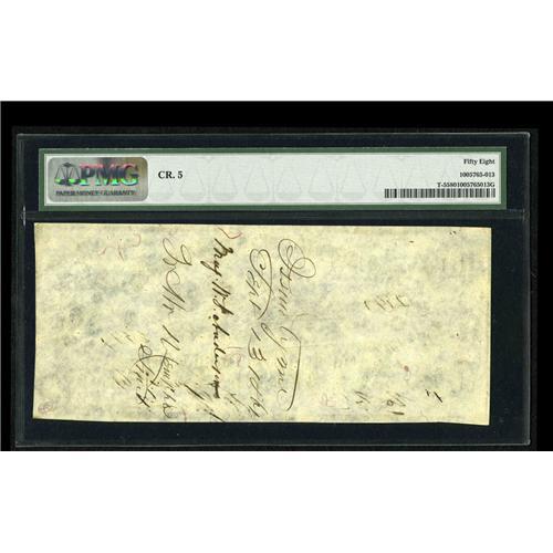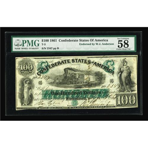 <B>T5 $100 1861.</B></I> This beautiful issue, known as the "First Richmond" issue, was printed by the Southern Bank Note Company (the New Orleans branch of the American Bank Note Company) and features a wonderful locomotive vignette of the era in the center. This example is well margined for the issue, and is graded <B>Choice About Unc 58</B></I> by PMG. A lovely example of the type and ideal for a high grade CSA collection.