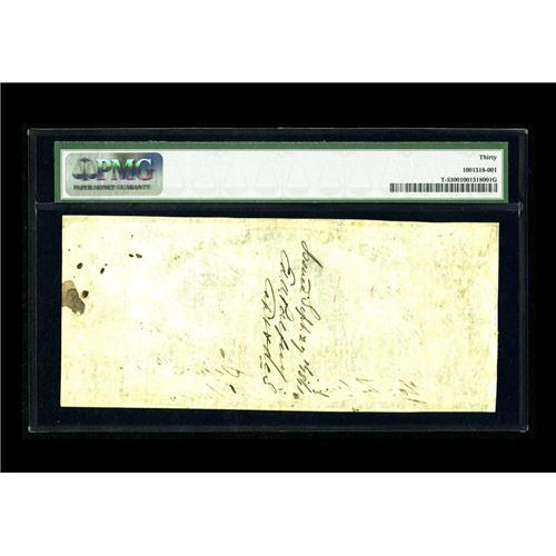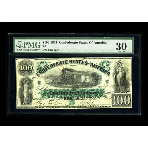 <B>T5 $100 1861.</B></I> This "First Richmond" issue has impeccable eye appeal for a moderately circulated issue. The penned signatures and serial number are all still bold. A few vertical folds and light handling account for the grade, but the paper is solid, not even showing a hint of weakness. On back is the penned date, "Issued Sept. 27, 1861." <B>PMG Very Fine 30.</B></I><BR><BR><b>Shipping:</b> Coin/Currency (<a target="_blank" href="http://www.heritageauctions.com/common/shipping.php">view shipping information</a>)