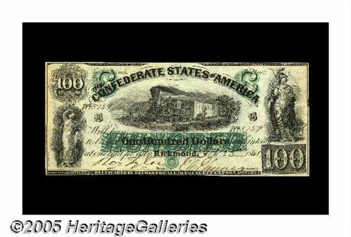 <B>T5 $100 1861.</B></I> This beautiful note was the first issue of the Confederacy after its capital was moved from Montgomery to Richmond subsequent to Virginia's secession from the Union. It was printed by the "Southern Bank Note Company," (which was actually the New Orleans branch of the American Bank Note Company) and features a most attractive railroad vignette in the center of the note. This example is well margined for the issue, and misses the full Uncirculated grade due only to the lightest of vertical folds. <B>Choice About Uncirculated,</B></I> an ideal piece for any high-end collection of CSA notes.