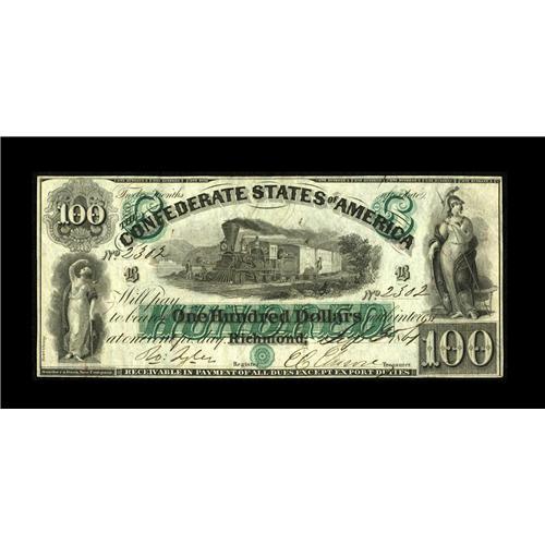 <B>T5 $100 1861.</B></I> We cannot find any faults with this early C-note that sports dark green ink, sharp edges, embossing, and natural paper wave. Intense scrutiny could not come up with a single pinhole. The back was endorsed by a Major W.I. Anderson stationed in Memphis. <B>Choice Crisp Uncirculated.</B></I><BR><I>From The William A. "Bill" Bond Collection</B></I><BR><BR><b>Shipping:</b> Coin/Currency (<a target="_blank" href="http://www.heritageauctions.com/common/shipping.php">view shipping information</a>)