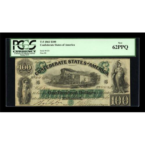 <B>T5 $100 1861 Cr. 5 PF-1</B></I><BR> The colors are bright on this original note that was printed by the Southern Bank Note Company (the New Orleans branch of the ABNCo.). Less than 6,000 notes were issued. The back features the endorsement, "Disbursed Sept. 17th, 1861, Ferdinand Molloy, Capt of CS." <B>PCGS New 62PPQ.</B></I><BR><BR><b>Shipping:</b> Coins & Currency (<a target="_blank" href="http://www.heritageauctions.com/common/shipping.php">view shipping information</a>)