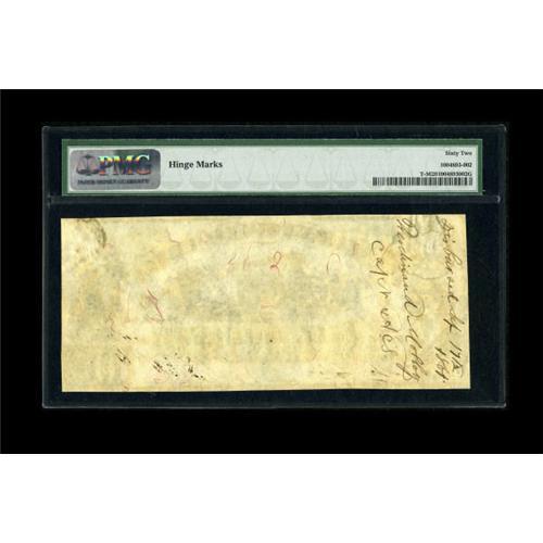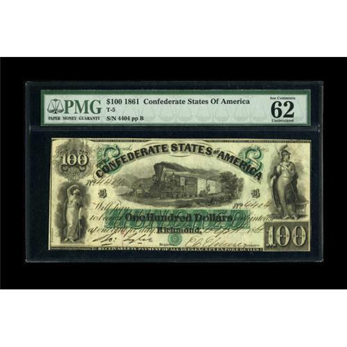 <B>T5 $100 1861.</B></I><BR> This piece, along with the upcoming PMG Graded 63 T6, resided in the same collection, hand picked for their eye appeal and originality. Deep green hues of the overprint, jet black printed devices, and perfectly inked signatures were applied to a canvas that has remained bright with original paper waves. The only mentionable distraction on either note are minor hinge marks from a bygone era where stamp hinges were used by collectors to display currency in notebooks. <B>PMG Uncirculated 62.</B></I><BR><BR><b>Shipping:</b> Coins & Currency (<a target="_blank" href="http://www.heritageauctions.com/common/shipping.php">view shipping information</a>)