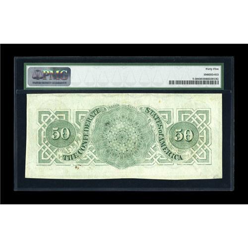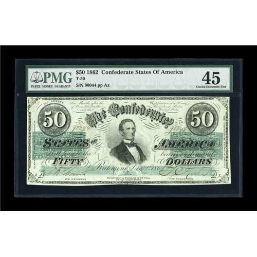 <B>T50 $50 1862.</B></I> A lone center fold is noted through the holder, though we would not disagree with a grade of About New. The color is bright and the paper is ideal, with a fairly well centered CSA watermark worthy of mention. <B>Choice Extremely Fine 45.</B></I><BR><BR><b>Shipping:</b> Coins & Currency (<a target="_blank" href="http://www.heritageauctions.com/common/shipping.php">view shipping information</a>)