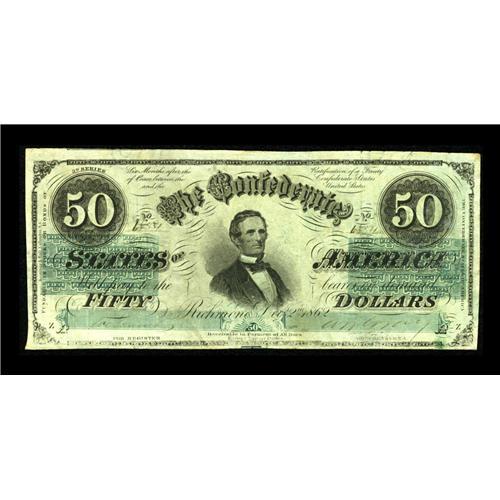 <B>T50 $50 1862.</B></I> This <B>Very Fine+</B></I> $50 displays stamp hinge residue and a little bit of foxing.<BR><I>From The George P. Hammerly Collection</B></I><BR><BR><b>Shipping:</b> Coin/Currency (<a target="_blank" href="http://www.heritageauctions.com/common/shipping.php">view shipping information</a>)