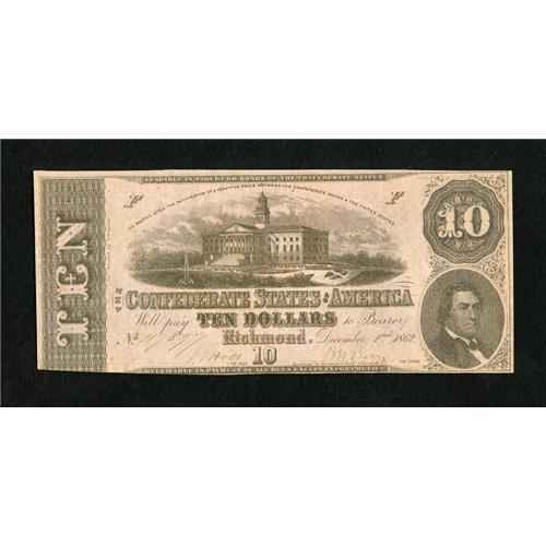 <B>T52 $10 1862.</B></I> A lone vertical fold right of center limits the grade on this otherwise fully uncirculated issue. <B>Choice About Uncirculated.</B></I><BR><BR><b>Shipping:</b> Coins & Currency (<a target="_blank" href="http://www.heritageauctions.com/common/shipping.php">view shipping information</a>)