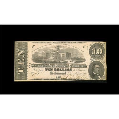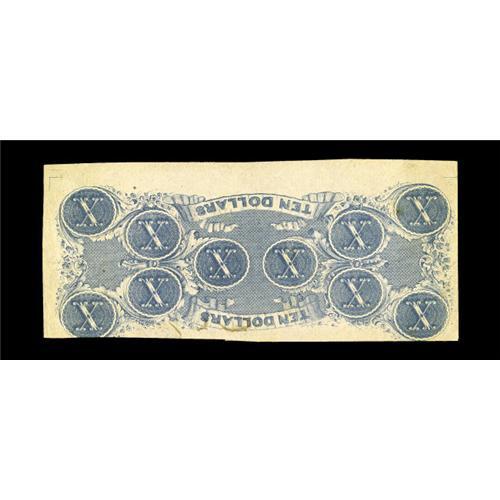 <B>T52 PF-9IB $10 1862 Inverted Back.</B></I> This is an example of a very rare inverted back error note. It carries serial number 7281-C. This is also the sixth finest known note in the Fricke Condition Census. A classic Confederate error. <B>Choice About Uncirculated.</B></I>