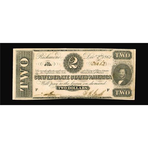 <B>T54 PF-6 $2 1862.</B></I> Not a hint of circulation, but the bottom edge comes up to the frame line at center. <B>Choice Crisp Uncirculated.</B></I>