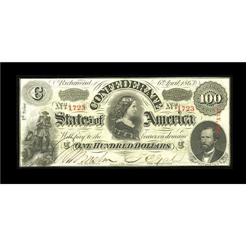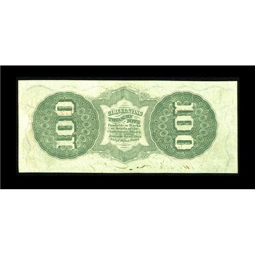 <B>T56 $100 1863.</B></I> Dark inks and a four-digit serial number awaits the buyer of this embossed note. <B>Crisp Uncirculated.</B></I>