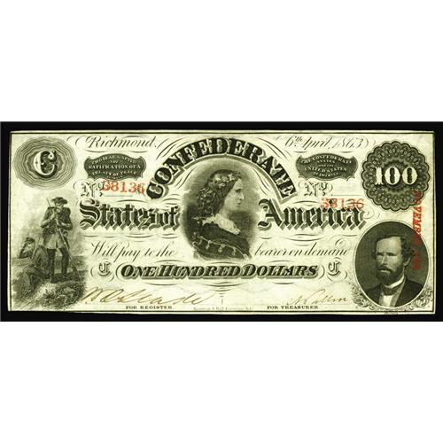 <B>T56 $100 1863.</B></I> Light folds are uncovered after much scrutiny along with a couple of pinholes. <B>Extremely Fine.</B></I><BR><I>From The Benjamin Rush Powel Collection of Confederate Currency.</B></I>