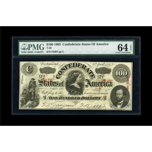 <B>T56 $100 1863.</B></I><BR> Front to back registration is good on this 1st series issue stamped April, 1863. <B>PMG Choice Uncirculated 64 EPQ</B></I>.<BR><BR><b>Shipping:</b> Coins & Currency (<a target="_blank" href="http://www.heritageauctions.com/common/shipping.php">view shipping information</a>)