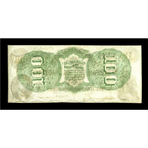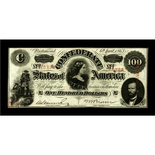 <B>T56 PF-3 Cr-402 $100 1863.</B></I> This <B>Crisp Uncirculated</B></I> Lucy Pickens has a partial CSA Treasury Stamp at the lower left corner, along with a full frame line. Very light handling keeps this from a higher grade.<BR><I>From The William A. "Bill" Bond Collection</B></I><BR><BR><b>Shipping:</b> Coin/Currency (<a target="_blank" href="http://www.heritageauctions.com/common/shipping.php">view shipping information</a>)