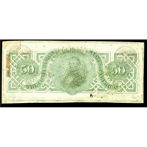 <B>T57 $50 1863.</B></I> Serial number embossing is noticed on this $50. <B>Choice Crisp Uncirculated.</B></I><BR><I>From The Benjamin Rush Powel Collection of Confederate Currency.</B></I>