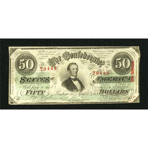 <B>T57 $50 1863.</B></I><BR> This $50 has nice color, edges, and paper. <B>Very Fine,</B></I> CC.<BR><BR><b>Shipping:</b> Coins & Currency (<a target="_blank" href="http://www.heritageauctions.com/common/shipping.php">view shipping information</a>)