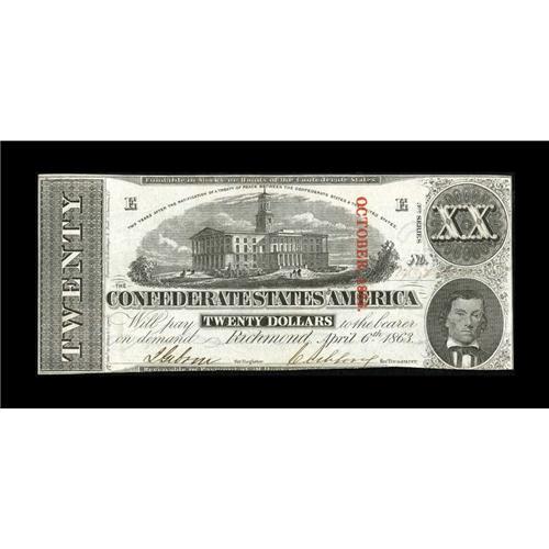 <B>T58 $20 1863.</B></I> This 3rd Series $20 has bright paper that reveals a pinhole after intense scrutiny. The bottom edge drifts inside the frame line. <B>Crisp Uncirculated.</B></I><BR><BR><b>Shipping:</b> Coins & Currency (<a target="_blank" href="http://www.heritageauctions.com/common/shipping.php">view shipping information</a>)