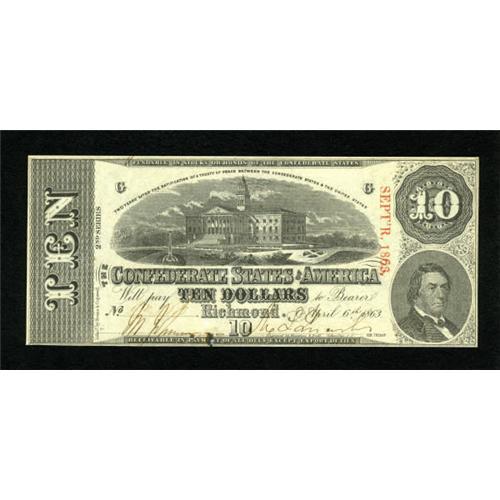 <B>T59 $10 1863.</B></I><BR> An approximate three-eighths inch bottom edge tear has been repaired, but now the repair has failed. <B>Crisp Uncirculated.</B></I><BR><BR><b>Shipping:</b> Coins & Currency (<a target="_blank" href="http://www.heritageauctions.com/common/shipping.php">view shipping information</a>)