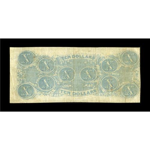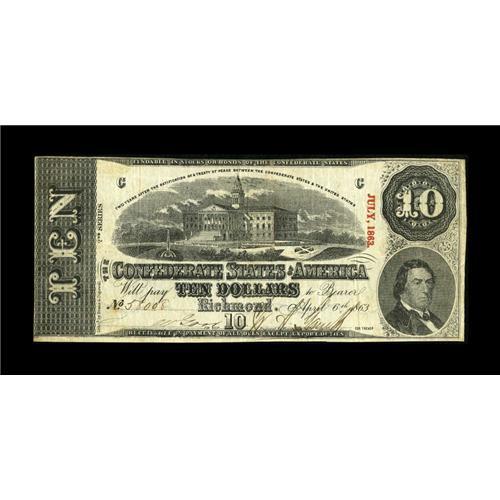 <B>T59 Inverted $10 1863.</B></I> Rarely, if ever, do we have the opportunity to offer a note of any kind that we feel comfortable calling "unique". However, we feel quite satisfied with that terminology, as this variety was unknown to the late Grover Criswell, Dr. Douglas Ball, Philip Chase, and all other renowned researchers of Confederate paper money. Even the vast holdings of the National Archives and the Museum of the Confederacy do not possess an example of this note. Listed as "Non-Collectible" in the Fricke tome, this is the note stated in the Condition Census, listed as a PF-26IB. This note displays great clarity on both sides, with no problems whatsoever. Expect to see spirited bidding on this note, as this is a must have for those wanting to complete a set of T-59 inverted backs.<BR><BR><b>Shipping:</b> Coins & Currency (<a target="_blank" href="http://www.heritageauctions.com/common/shipping.php">view shipping information</a>)