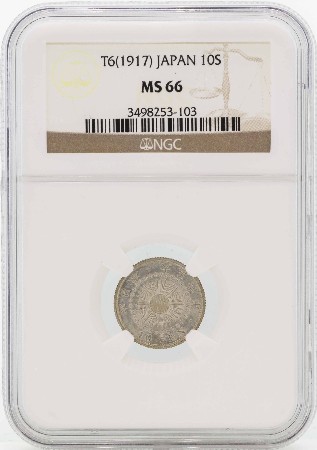 One T6(1917) Japan 10 Sen Silver Coin NGC MS66.