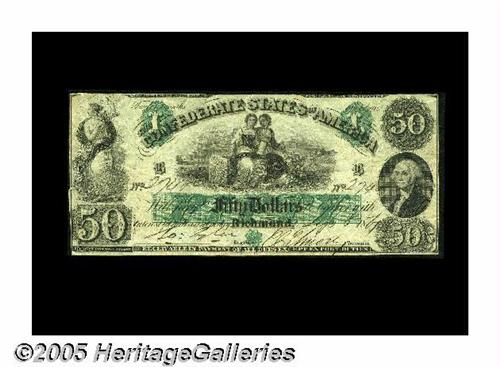 <B>T6 $50 1861.</B></I> A nice evenly circulated example of the Richmond Issue $50. This is a scarce note in any grade, and this piece will fit perfectly into any set of high-end circulated specimens. Bright <B>Fine-Very Fine,</B></I> flawless except for a handful of tiny pinholes at the left end that affect nothing.