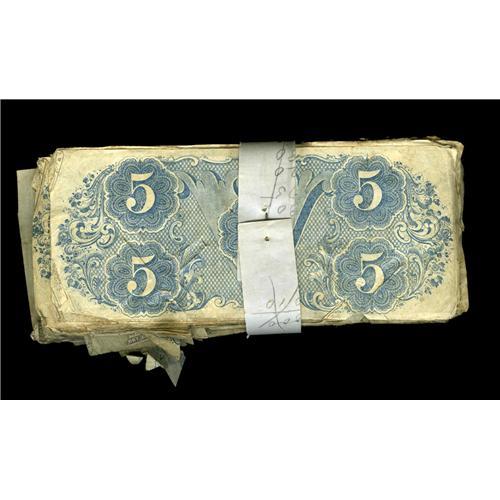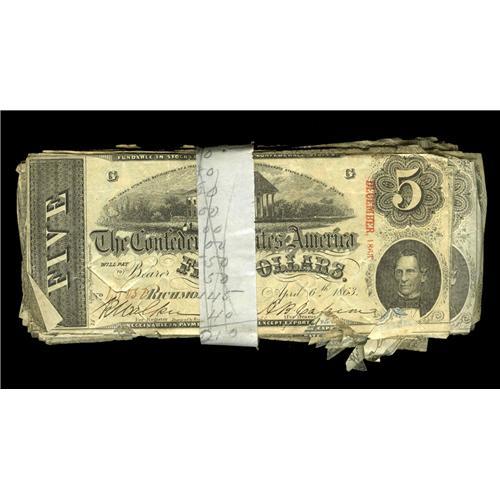 <B>T60 $5 1863 Pack of Cancelled Notes.</B></I> This is an interesting lot that looks like it has been together since these notes were banded and cut cancelled together by the Confederate Treasury Department. <B>Fair or Better.</B></I><BR><I>There will be no returns on this lot for any reason.</B></I>