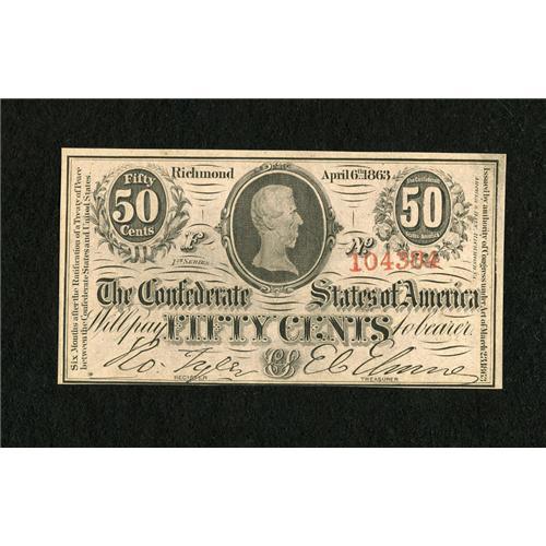 <B>T63 50 Cents 1863.</B></I> The T63 issue has red serial numbers. These are strongly embossed on this note. <B>Crisp Uncirculated.</B></I><BR><BR><b>Shipping:</b> Coins & Currency (<a target="_blank" href="http://www.heritageauctions.com/common/shipping.php">view shipping information</a>)