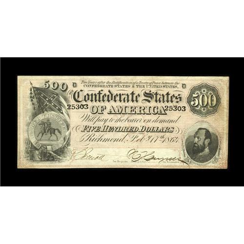 <B>T64 $500 1864.</B></I> A light center fold and a bit of handling are seen on this bright CSA high denomination issue that carries a partial Palmetto stamp on the back at lower left. <B>About Uncirculated.</B></I>