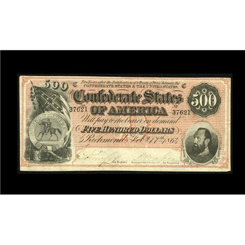 <B>T64 $500 1864.</B></I> A lovely example which displays just a couple of very light folds. It bears the high serial number 37621 along with the heavy dark red background that is much sought after by collectors. <B>About Uncirculated.</B></I>