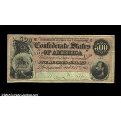 T64 $500 1864. A very nice, broadly margined example of this popular type that bears a vignette of the Rebel flag above the CSA seal at left, and a portrait of beloved General Thomas Jonathan "Stonewall" Jackson at right. About Uncirculated. Important notice: We expect to be auctioning lots at the rate of 200-250 per hour. Sometimes eBay Premier live bid software cannot keep up with that pace, so we strongly recommend that you place a realistic proxy bid now as insurance to avoid disappointment. Also please note that all Heritage/CAA lots purchased through eBay Premier carry a 20% Buyer's Premium. Please make sure you read the Terms and Conditions.