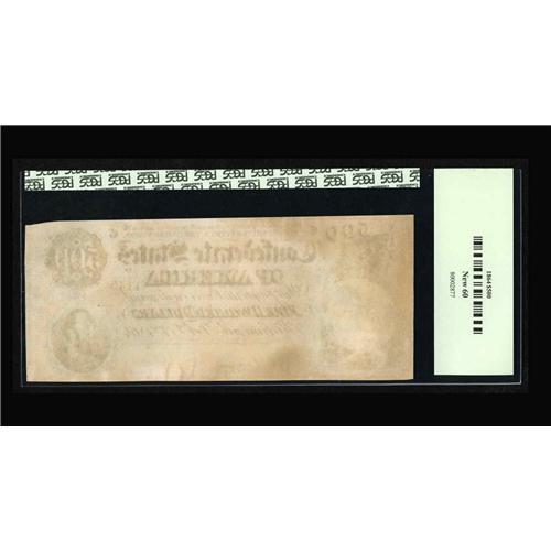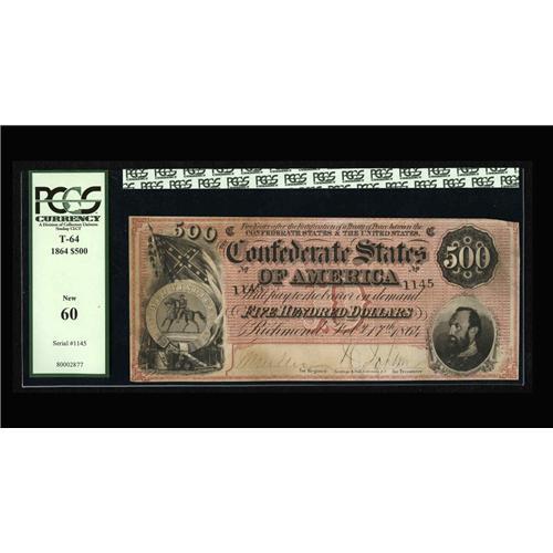 <B>T64 $500 1864.</B></I> An attractive dark red background and serial number 1145-C graces this $500. Light foxing and an edge that is below the frame line in the vicinity of the upper right corner are observed. <B>PCGS New 60.</B></I>