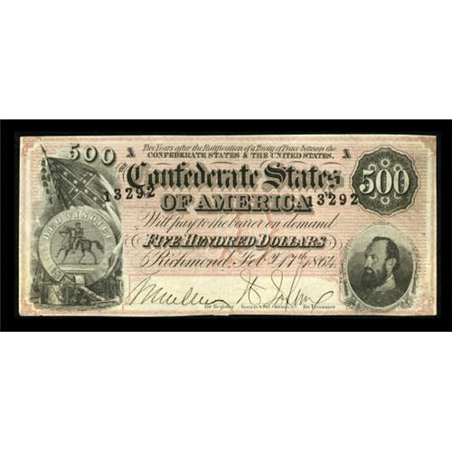 <B>T64 $500 1864 PF-1, Cr. 489.</B></I><BR> This is a beautifully embossed $500 that saw General Lee's surrender at Appomattox before it had a chance to enter circulation. <B>Choice Crisp Uncirculated.</B></I><BR><BR><b>Shipping:</b> Coins & Currency (<a target="_blank" href="http://www.heritageauctions.com/common/shipping.php">view shipping information</a>)