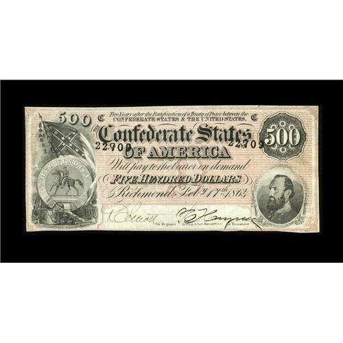 <B>T64 $500 1864.</B></I> Two light vertical folds are all the wear this bright D-note has seen and very solid margins complete it. <B>Extremely Fine-About Uncirculated.</B></I>