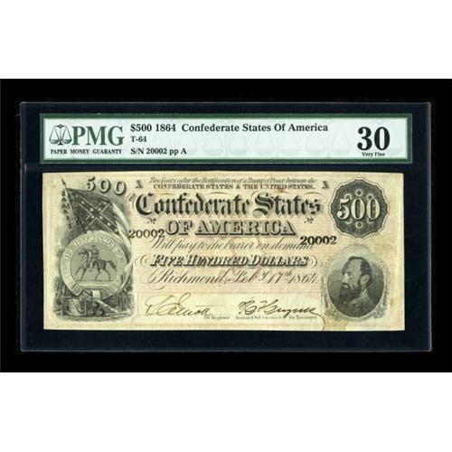 <B>T64 $500 1864.</B></I><BR> Interesting palindrome serial number 20002 graces this $500. Bold embossing of "Confederate States of America" is easily viewed through the third-party holder. <B>PMG Very Fine 30.</B></I> <BR><BR><b>Shipping:</b> Coins & Currency (<a target="_blank" href="http://www.heritageauctions.com/common/shipping.php">view shipping information</a>)