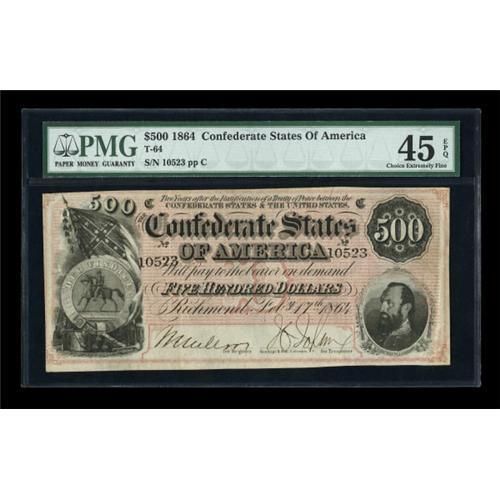 <B>T64 $500 1864.</B></I><BR> Three light folds account for the grade on this pleasing CSA D-note. <B>PMG Choice Extremely Fine 45 EPQ</B></I>.<BR><BR><b>Shipping:</b> Coins & Currency (<a target="_blank" href="http://www.heritageauctions.com/common/shipping.php">view shipping information</a>)