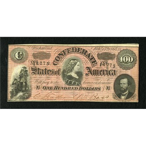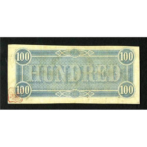 <B>T65 $100 1864.</B></I> This <B>Extremely Fine</B></I> piece has deep red inks on the front and a complete palmetto stamp on the back.<BR><I>From The Jacob and Heather Dedman Collection</B></I><BR><BR><b>Shipping:</b> Coins & Currency (<a target="_blank" href="http://www.heritageauctions.com/common/shipping.php">view shipping information</a>)